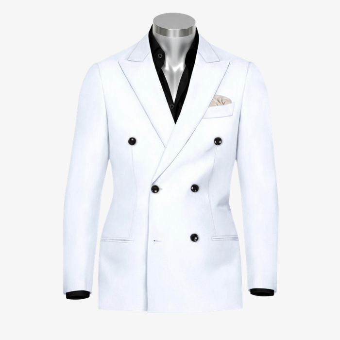 Elevate your formal wardrobe with this impeccably tailored Monochrome Elite suit, designed to command attention. The jacket features a classic double-breasted 6-button front, peak lapels, and contrasting black buttons that pop against the pristine white fabric. Paired with coordinating flat-front trousers, the ensemble offers a sharp, streamlined fit that bridges the gap between traditional elegance and contemporary edge. Whether it’s a red-carpet gala, a luxury wedding, or a high-profile summer event, this suit ensures you stand out with unparalleled poise.