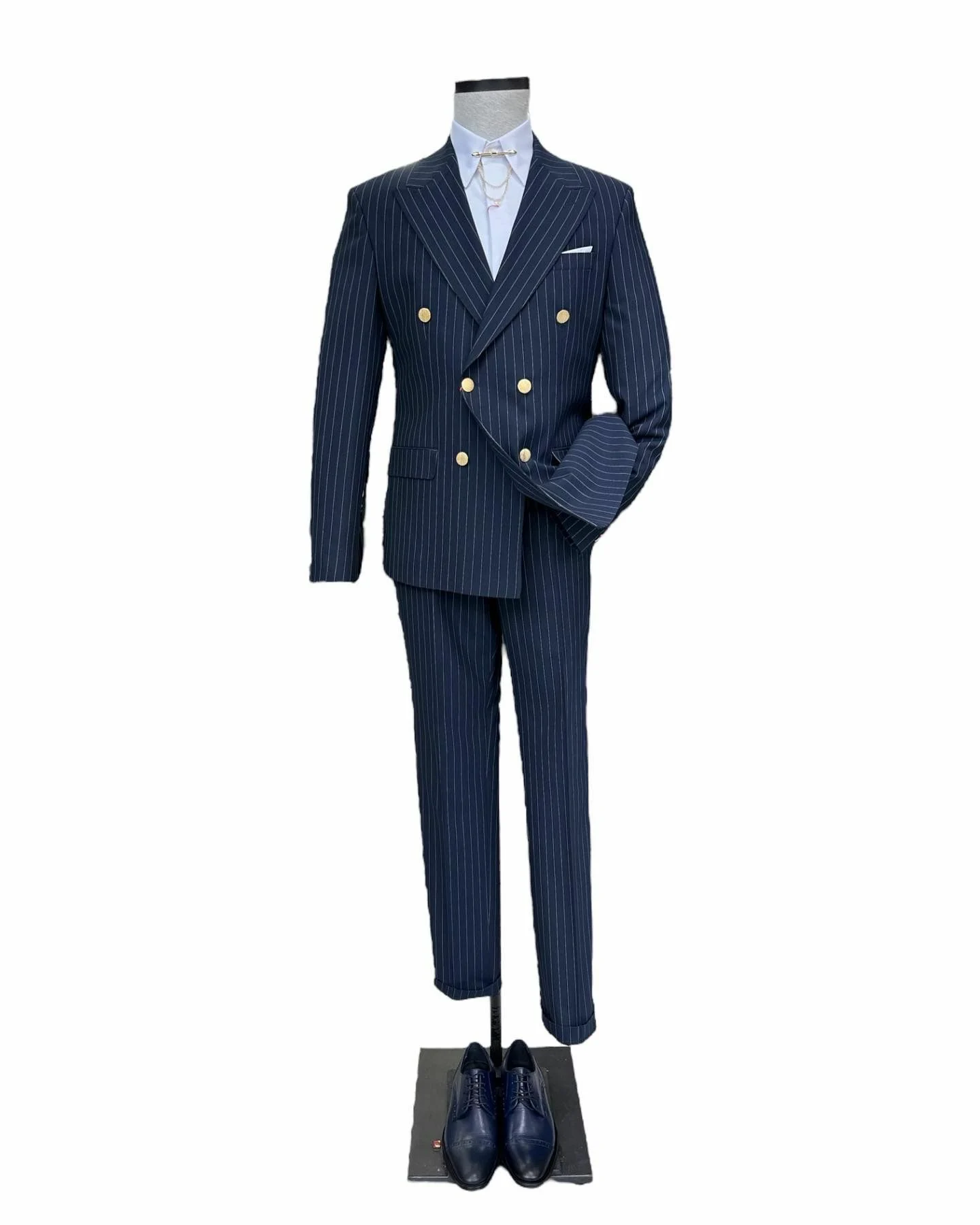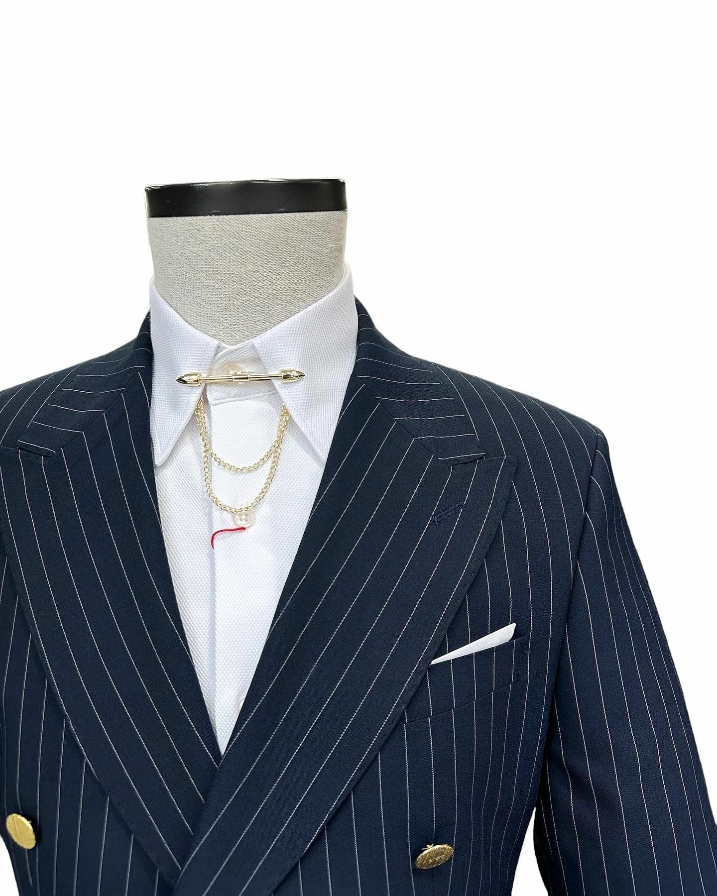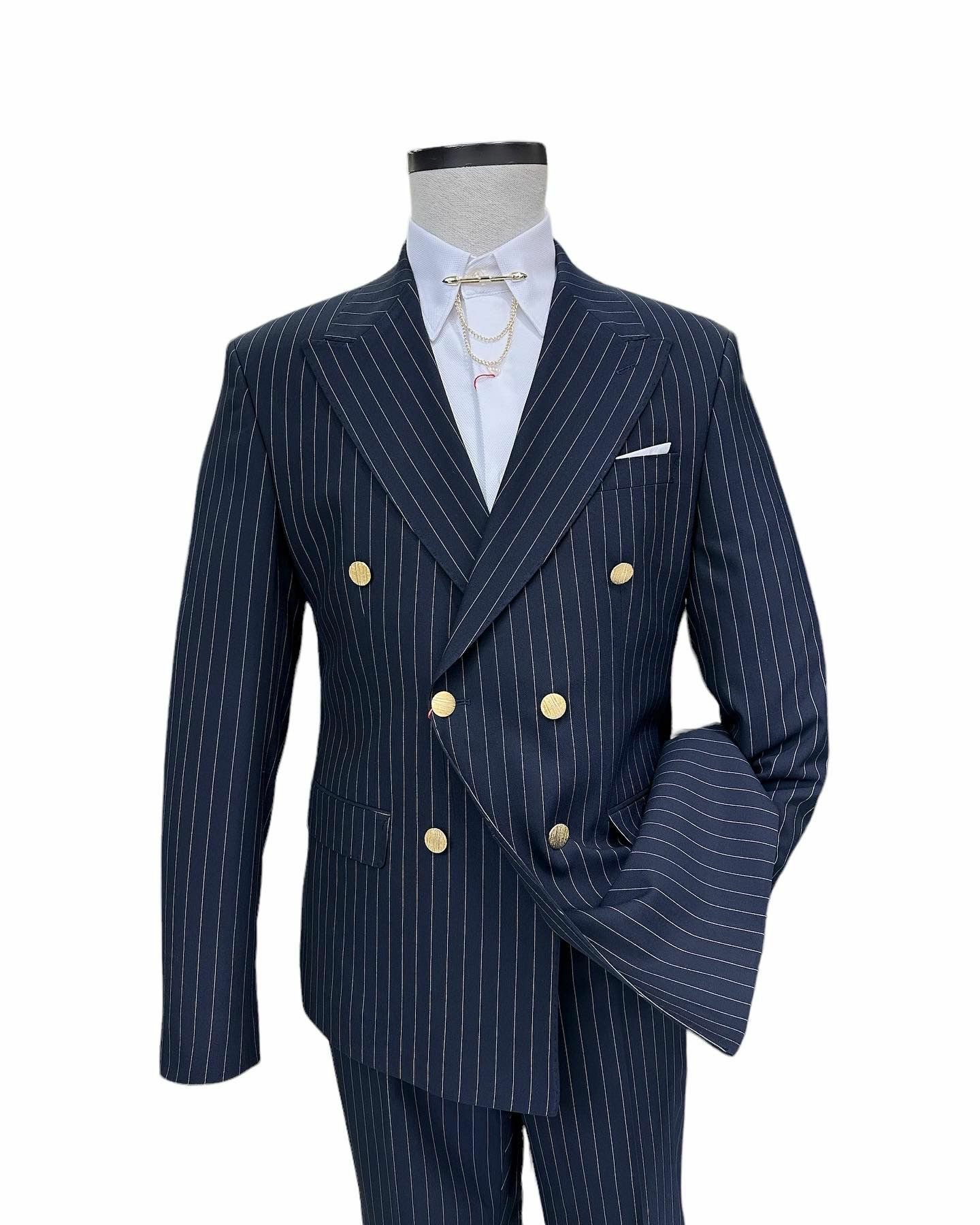 The Double-Breasted Tuxedo Suit is a highly formal and architectural take on black-tie attire, known for its distinguished and structured silhouette.